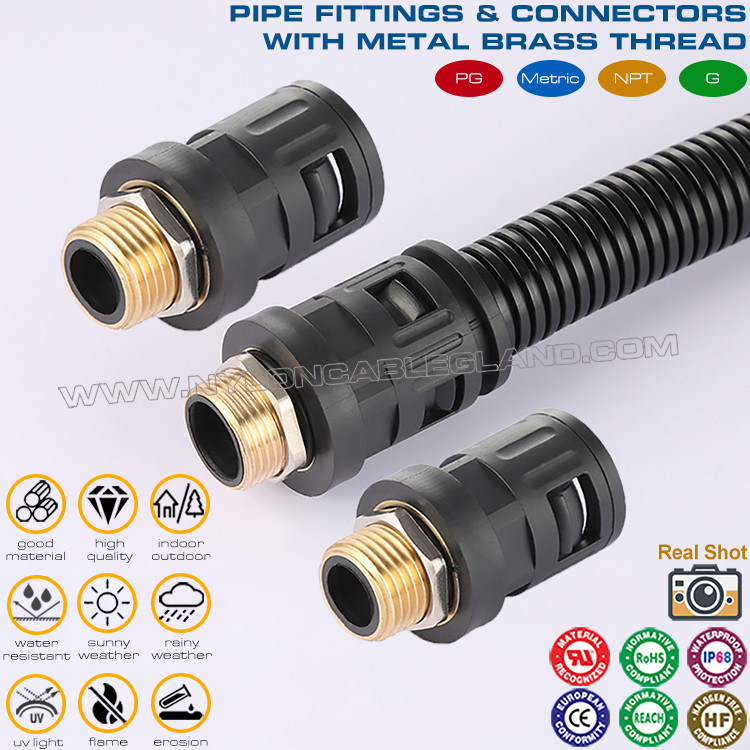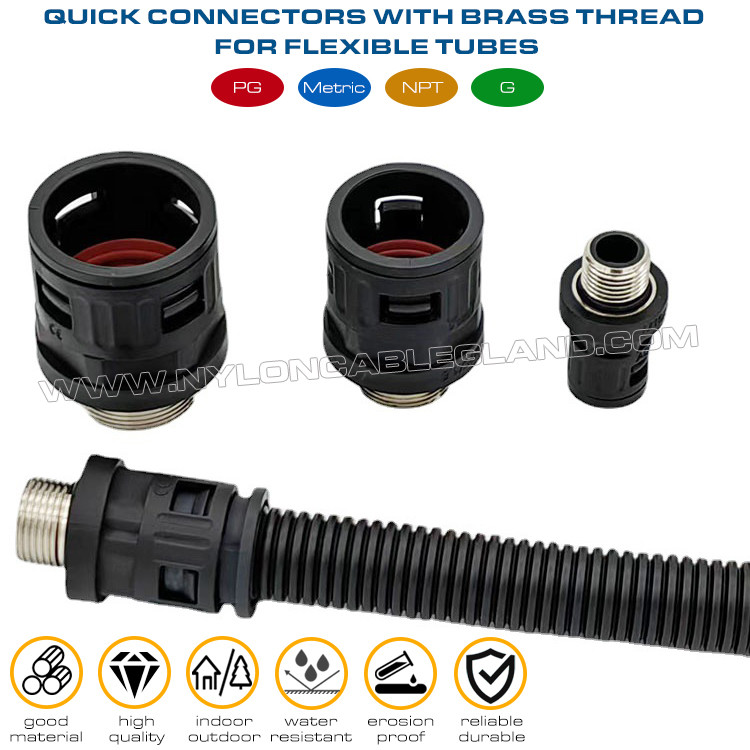 Nylon 6 Quick Connectors (Joints, Fittings) black RAL9005 c/w Metal Male Thread PG7~PG48 for Corrugated Tubes AD7~AD108 are a sort of connection devices widely used in electricity, liquid and gas delivery systems. It has high sealing performance and is specially used to connect corrugated pipes. It can maintain safe and reliable connections during the transportation of high temperature, high pressure and corrosive liquids or gases.