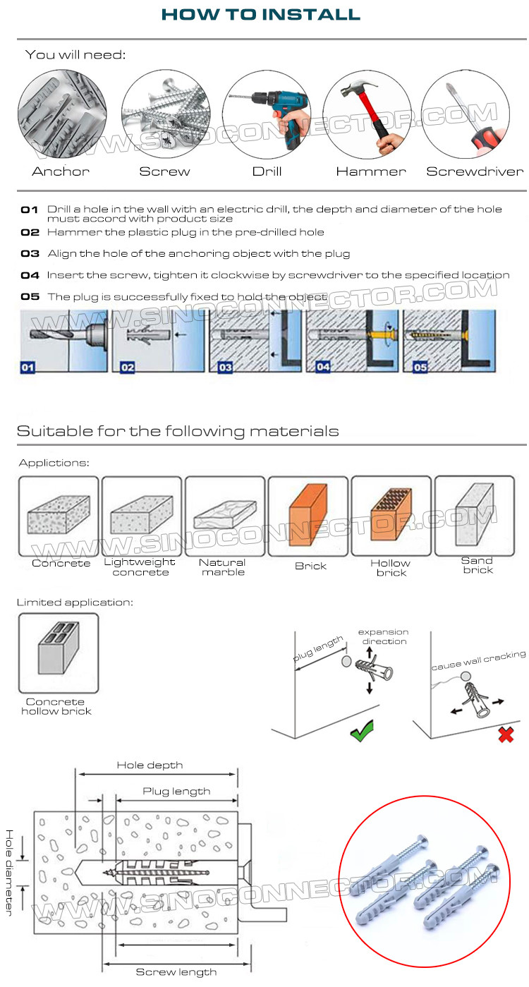 (6) Widely Used: Our expanding plastic plugs are versatile and can be used on various surfaces, including solid bricks, concrete, aerated concrete, high porosity bricks, gypsum boards, sand bricks, and other wall materials.