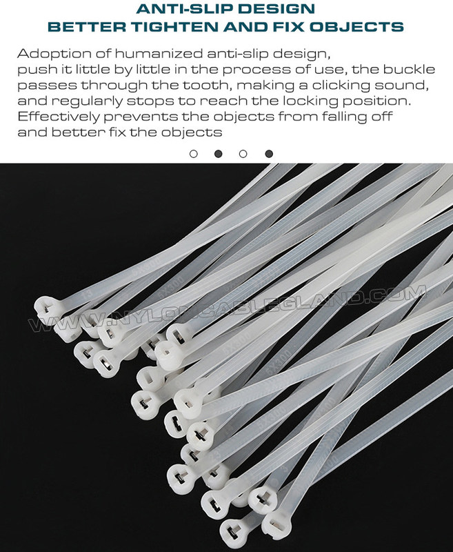 (2) Metal locking tooth - adopting an innovative metal tooth locking system, they have stronger mechanical performances than ordinary cable ties on the market, providing consistent performance, reliability and infinite adjustability through entire bundle range.