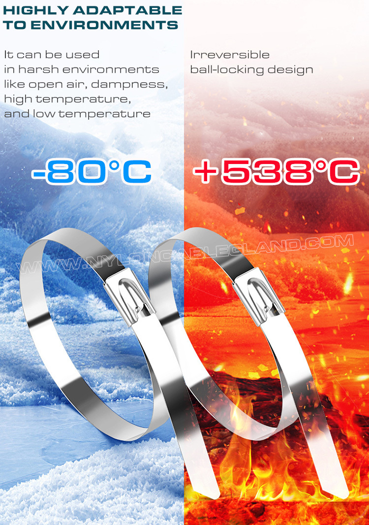 (3) Durable & heat resistance - compared with ordinary plastic cable ties, the stainless steel cable ties are anti-oxidation, anti-ultraviolet, sturdy and durable, they have better corrosion resistance, rust resistance, weather resistance and chemical resistance, and can provide a good protection in corrosive environments.