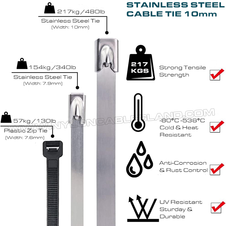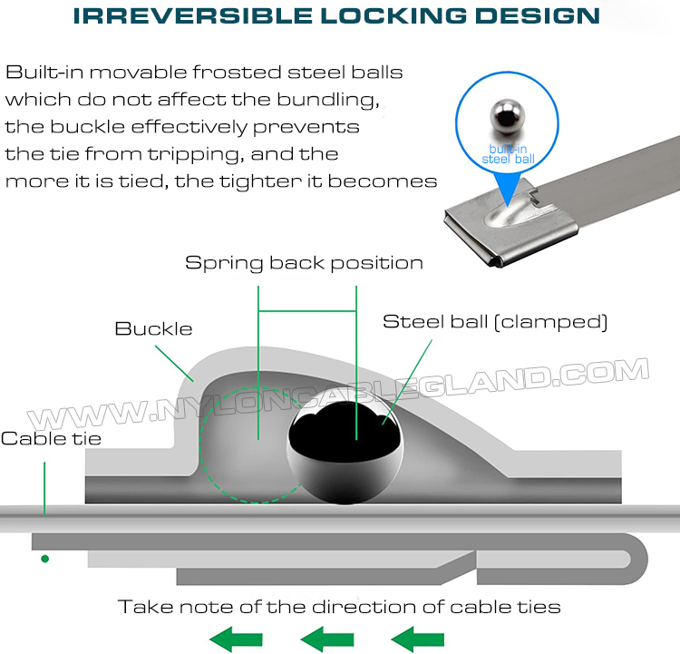 Stainless steel cable ties, also known as metal cable ties, are a kind of fastening straps made of high-quality stainless steel. The most common type is stainless steel cable tie with ball-locking mechanism, whose cleverly designed ball head allows for easy fastening without tools.