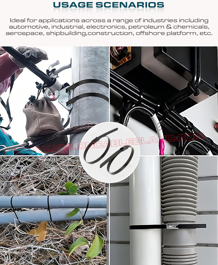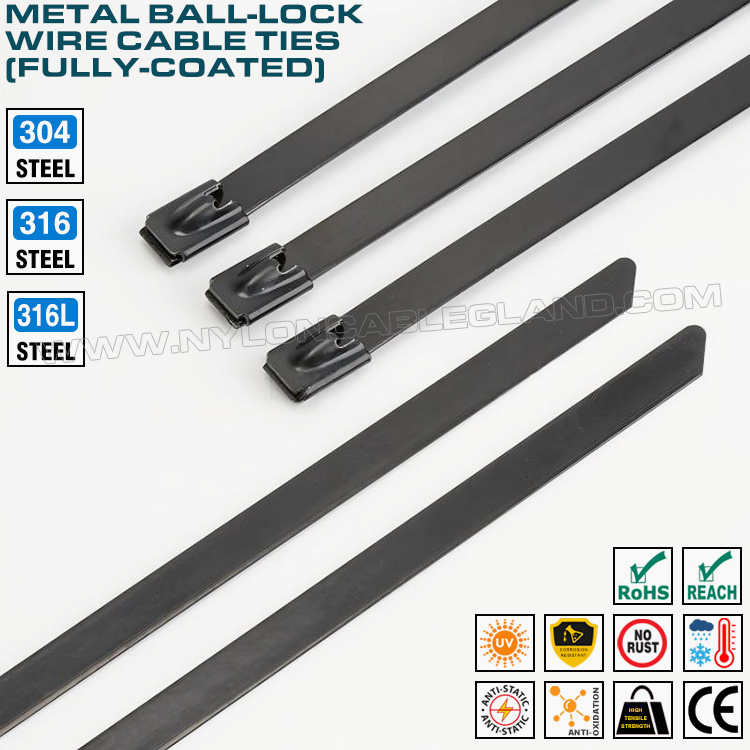 The fully-coated stainless steel cable ties metal zip ties are a kind of fasteners with ball-locking and complete epoxy (polyester or nylon 11) coating. The metallic buckle and belt are made in stainless steel 304, 316 or 316L and the whole surface is fully covered with a layer of epoxy material (polyester or nylon 11). The coating can provide additional protection to the cable ties and make it more corrosion-resistant, more wear-resistant and more beautiful. They are widely used for fixing and binding in the fields of power systems, chemical industry, marine, petroleum, machines, pipes, conducts, gardens, farms, etc.